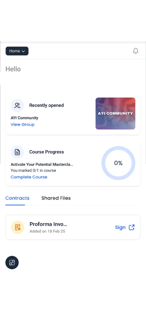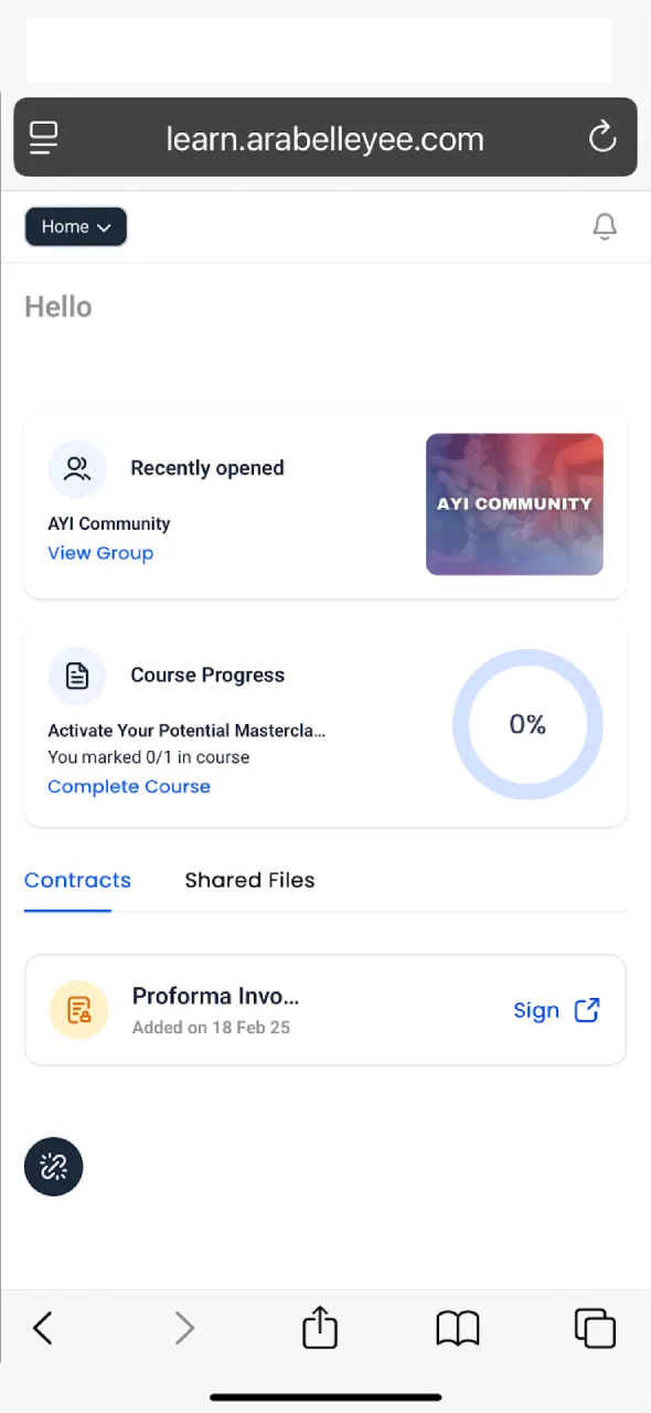 Arabelle Yee Application မှာ Sign In ဝင်ပြီးရင် မိမိ enroll လုပ်ထားတဲ့ program တွေ (ဒါမှမဟုတ်) join လုပ်ထားတဲ့ Group Container တွေ (Eg: In My World, AYI Community) ကို access လုပ်ဖို့ Home ကိုနှိပ်ပါ။