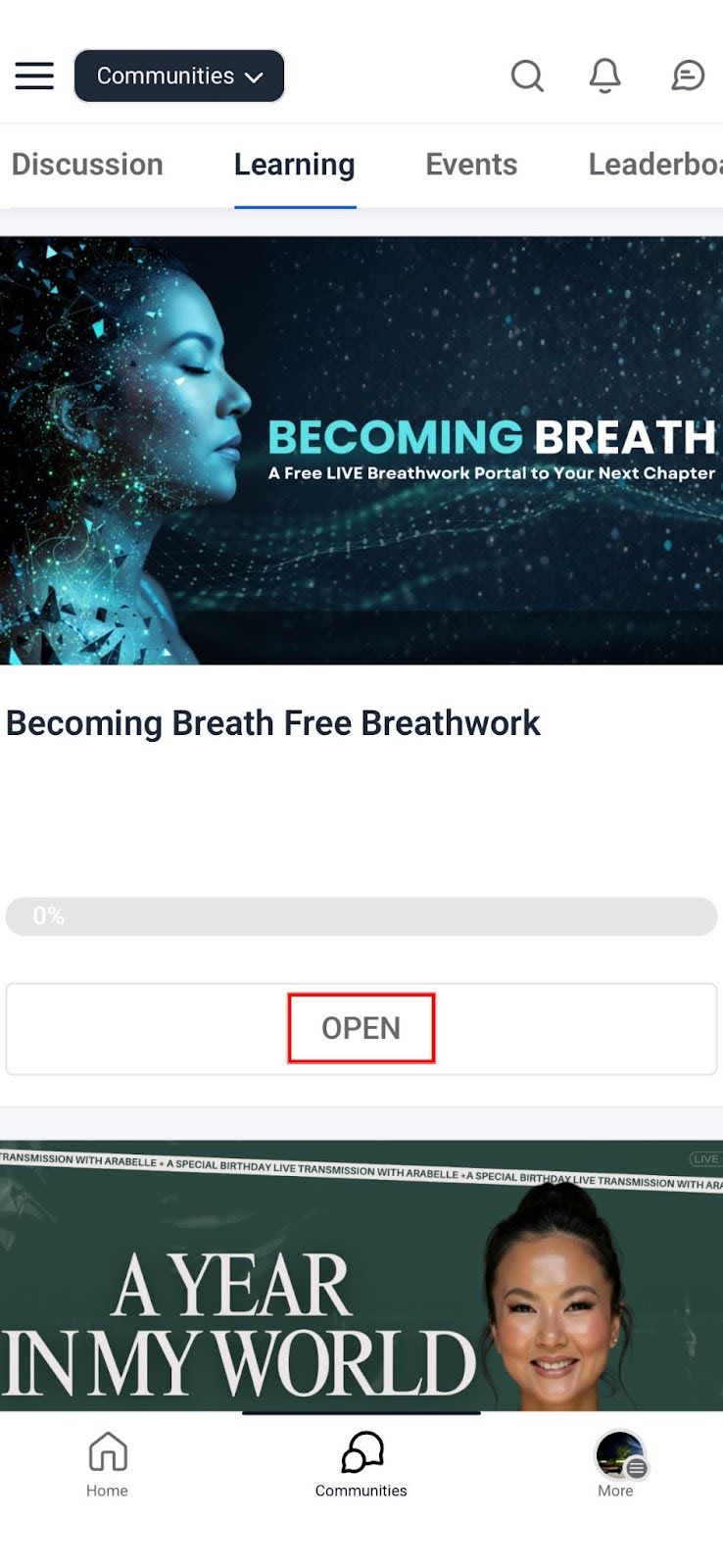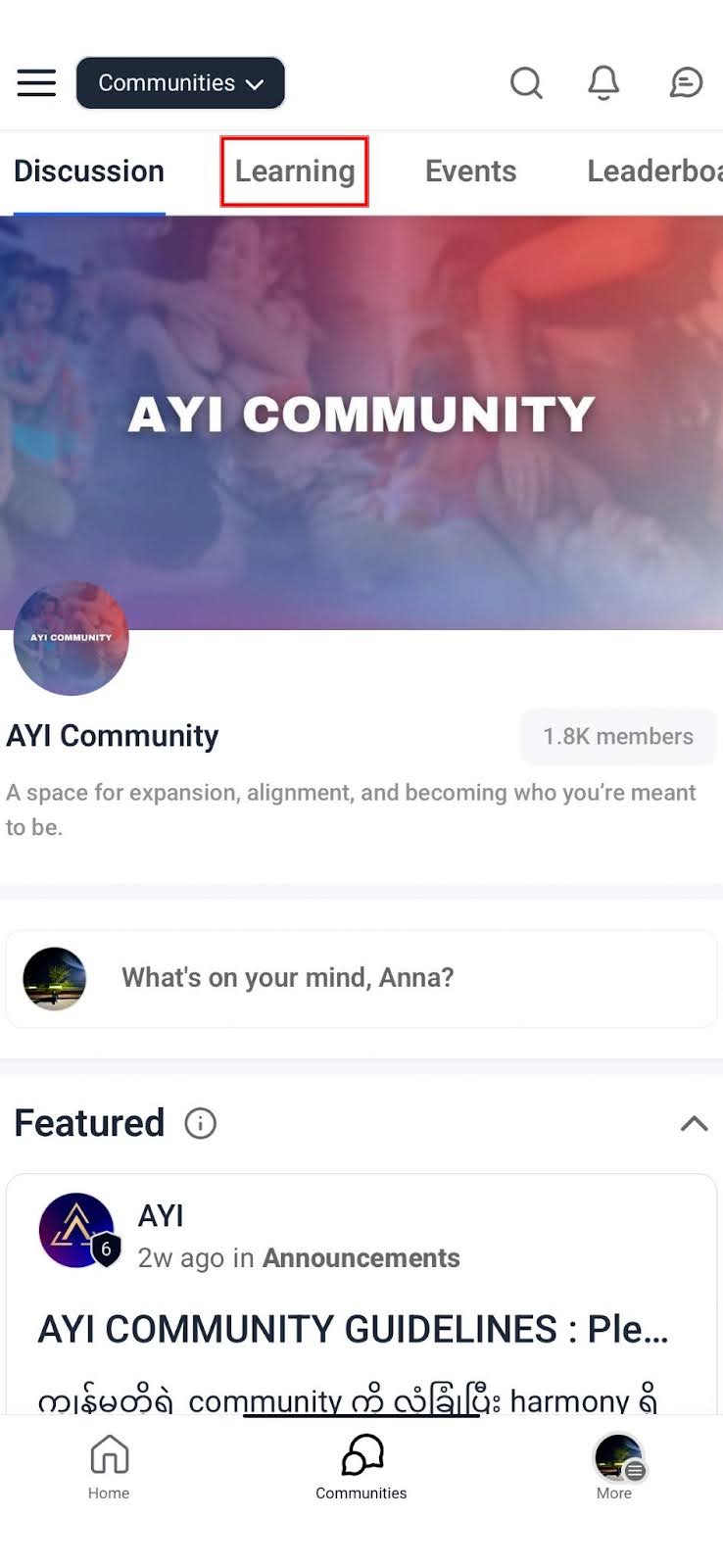 AYI Community ထဲမှာ ရှိတဲ့ program တွေကို access လုပ်ဖို့အတွက် Learning ကို နှိပ်ပါ။